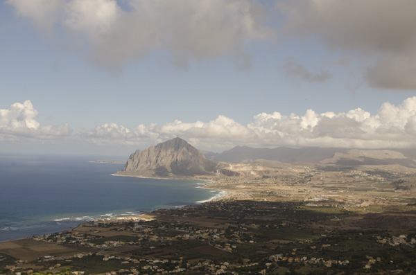 The view from Erice down to Trapani is just a glimpse fleetingly captured here and there between clouds and banks of fog.  On the drive down the mountain, once we were below the clouds, we could see the coast, the blue Mediterranean, stretching out below us. Hairpin turns helped us reach the bottom quickly.