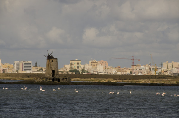 Just on the other side of Trapani, we stopped to see the salt flats.  The area is also a nature reserve under the auspices of the World Wildlife Fund.  We saw water birds, notably flamingoes, picturesquely fishing and wading in front of old windmills.  The background was the long harbor skyline of Trapani with the brilliant blue sky you’d expect to see in Italy.  It was a gorgeous day.