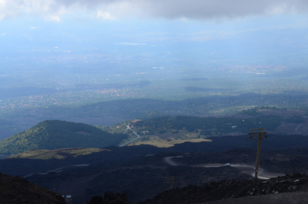 Looking back down the volcano – from the cable car. You can see the white bus we rode as it traverses a gravelly path.