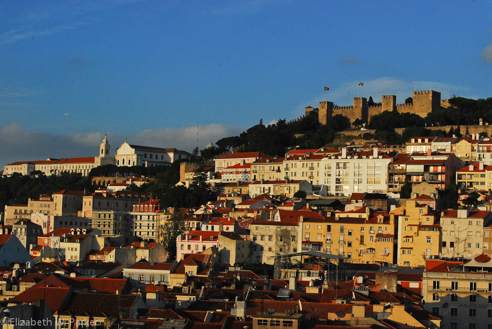 Our destination on this walk was the dramatic hilltop castle of São Jorge protectively overlooking the neighborhood below and looking out across the water, vigilant for enemy ships. The city is safely snuggled into a huge bay of the Tagus River, but just beyond, the Atlantic Ocean looms with both opportunity and danger. A Moorish castle, São Jorge is lovely inside with stone walkways and beautiful views from the ramparts.