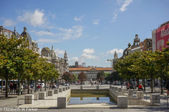 Neither Gerry not I could sleep that afternoon so we left the hotel early to walk back up to the area near the Praça de la Liberdade. We had skipped it in the morning because of the rain, but now the sun is shining. The Praça is at the base of a long, monumental way, the Praça do Municipio, bordered on one side by the Avenida dos Aliados, an homage to the Allies with who Portugal fought in the First World War (remember, Portugal was neutral in WWII). At the other end of this promenade is the city hall, a grandiose building, humbled only by its rather quotidian use. Grand buildings, trees, shops and cafés line the outer edges.