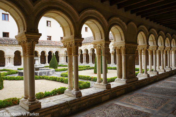 The cloisters are a wonderful short course on the religious decorative styles of the middle ages. Many of the arches have been restored to the way they once looked – but not all of them. This gives you the opportunity to examine the symmetry and beauty of the sculptural shapes (in those that have not been repainted) as well as the coloration and detailed painting of those where the polychromy has been restored. Polychromy is the art of painting with different colors. (Polychromy is the word our audio guide used. It was a new one for me but I looked it up and sure enough, it is an English word!) As it turns out we will see more of it in Burgos, and it is an important decorative technique for contemporaneous sculpture, too.