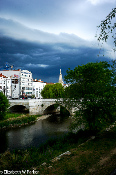 After the cathedral, we wandered down the Paseo del Espolón, a lovely pedestrian walkway flanking the river Arlanzón. The sky was black, though, and obviously bad weather was imminent! As we walked it began to rain (big, heavy drops) so we sought shelter and a beer and bathroom in a bar on the Plaza Mayor.