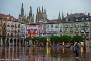 The Plaza Mayor may be “mayor” for Burgos, but it is really a very delightful shape, not quite round, not too big, surrounded by shops and bars all under a portico! Very cute. I wish we could have enjoyed it more by sitting under the trees or even in the plaza itself for our beers, but the rain was really coming down. Hoping that buying an umbrella would change our weather luck, we were disappointed and decided to return to the car.