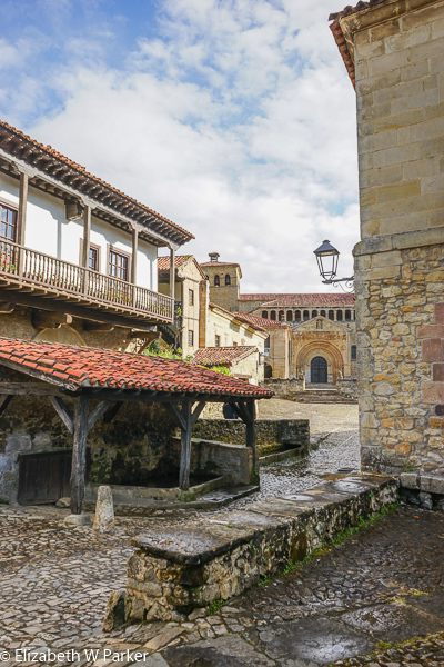 The public well, the church facade is in the background.