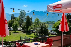 It was lunchtime when we reached Villeneuve, a town along Lake Geneva, also known in Switzerland as Lac Leman. We lunched on fried perch at a restaurant called Du Nord (also a hotel) with a view of the lake. The good weather is still with us, though it is beginning to get quite hot. We had packed for cooler weather…