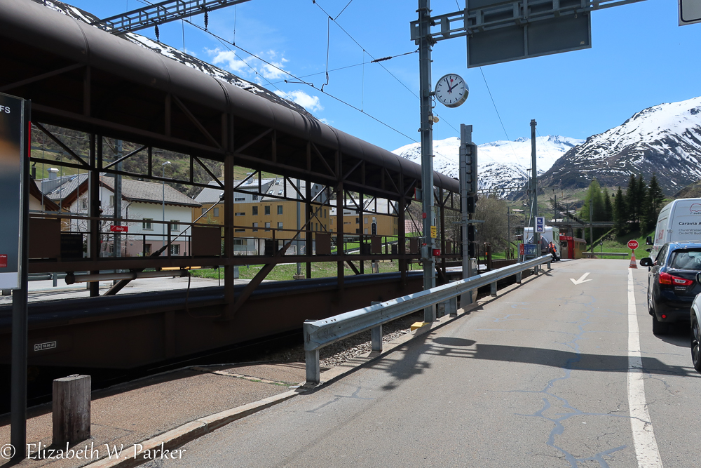 The joke was on us! We did take a ferry. Of sorts. We lined up with the other cars, and then drove onto a train. The train ferried us through a tunnel under the mountains. A first for all of us!