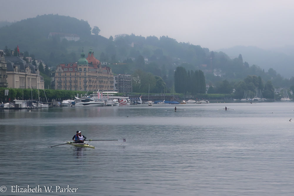 Saturday, in a budget saving move, we bought sandwiches for a picnic lunch and started a long drive around the eastern side of Lake Lucerne, an area called the “North Shore.” Though it was cloudy and misty, the drive was dry, and the clouds high enough that we began to see a hint of the famous Swiss mountains, until then totally obscured by fog and rain. Beautiful resort towns chain along the shores of the lake. There are flowers everywhere (and I shouldn’t need to tell you we have yet to see a speck of litter!)