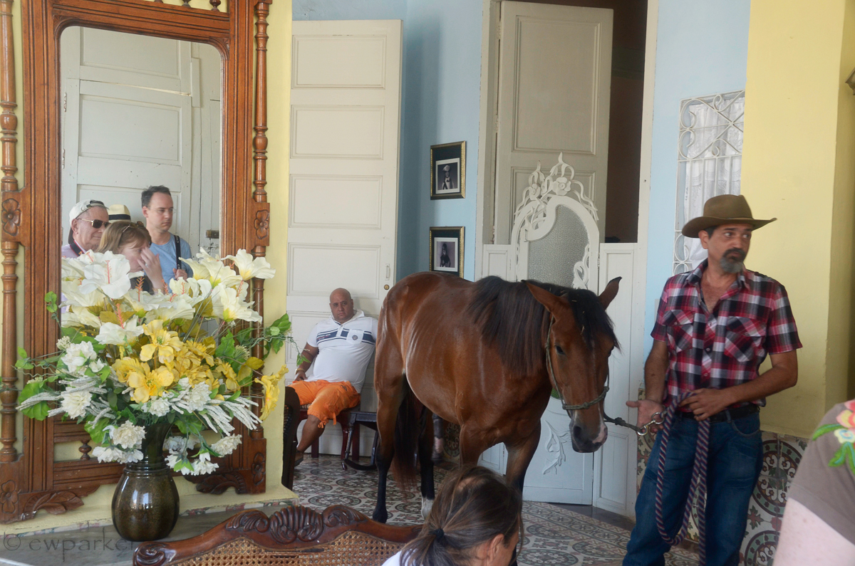 After lunch, a horse whisperer (José Muñoz Cocina) met us outside the restaurant and took us to his home (a bed and breakfast) where he has a photography gallery (which we didn’t really get to see) and where he trains horses (and their masters). This is the epitome of the new Cuban entrepreneur! Of course, the most fascinating business is the horse training. Here is a horse psychologist, putting into practice behaviorial techniques for training horses. Of course he has to train the owners, too (though like owners everywhere, I guess, they think they know better.)