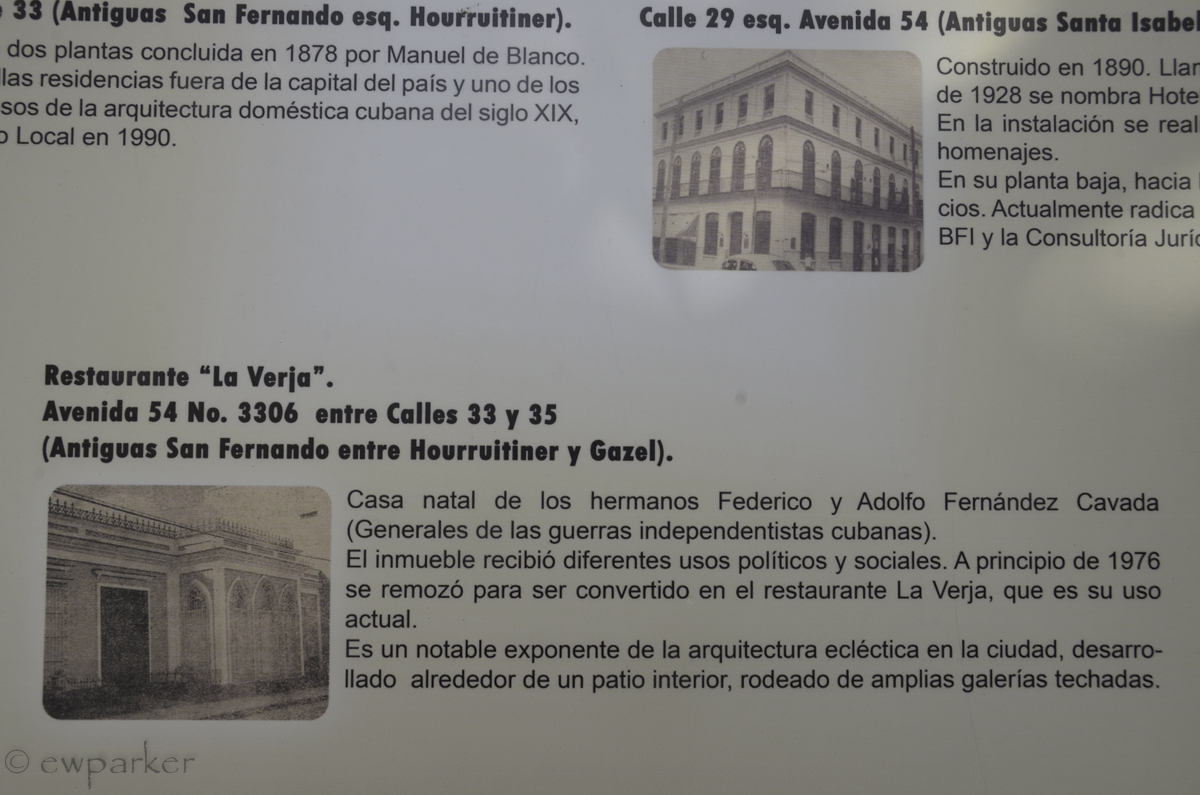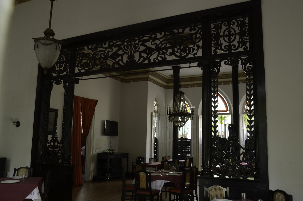 As we have in so many places in Cuba, we walked right in. Someone came over to help us, and when we explained that we just wanted to look around – no problem. Carmen had described some of the items of her family’s that are still in the restaurant and of course I went looking for those: An orange tree in the courtyard, paintings on the walls of the main dining room, and a magnificent wood ”divider” (I really don’t know what the word for it is) between the two areas of the dining room. My meager experience with colonial houses suggests that it divided the living room from the dining room when the house was a residence.