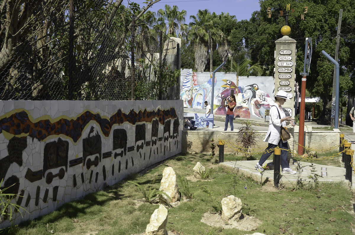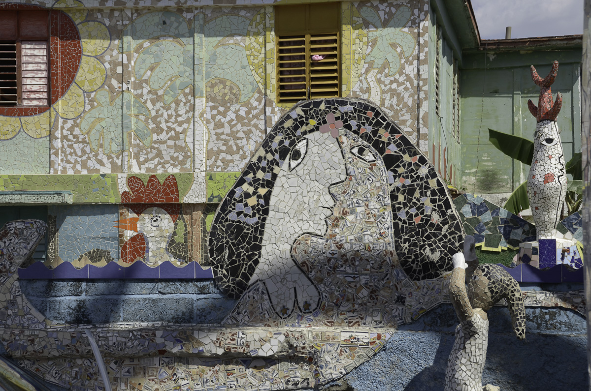 Following the community project, we drove to visit the home and studio of the artist José Fuster in Jaimanitas. This is the fantasy brainchild of a single artist. We had lunch in the artist’s home (hosted by his son – dad was off somewhere being famous) and to a one, we felt like we were in a wonderland inspired by Gaudí. I cannot describe the place with words, but fortunately I have lots of pictures to show you! (Food was good, too! Rice and black beans accompanied by other Cuban dishes, including a stewed lobster.)