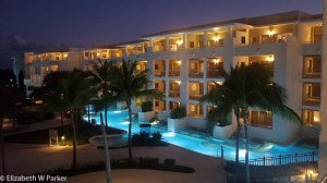 Here there are swim up suites at the bases of all the buildings, which are arranged in a large square. There are no rooms on the outside; those areas are given over to parking space (which is very little utilized.) The view from our room takes in a few pool areas, sinuous walkways, lots of palm trees. The great expanses we could see in Punta Cana are not possible here.