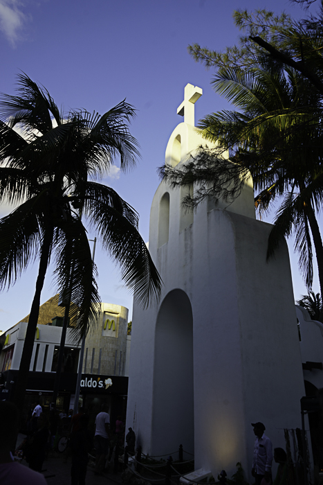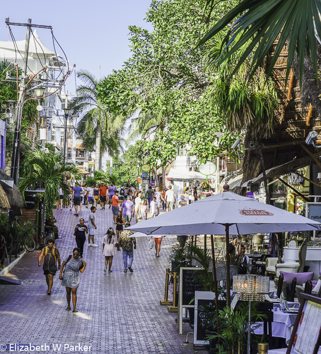 We did go into the town of Playa del Carmen one evening before dinner. The town, as I mentioned, is a regular city. We could drive through the city streets to get there, though the expressway would have been slightly faster. Near our hotel the neighborhoods are pretty rustic, lots of cinder blocks and zinc, hand-painted signs for businesses, dogs wandering in the street looking for shady nap. The closer one gets to the center of town, the better the buildings and the streets become, and right in the center, there are lots of high end shops and the construction is also very attractive.