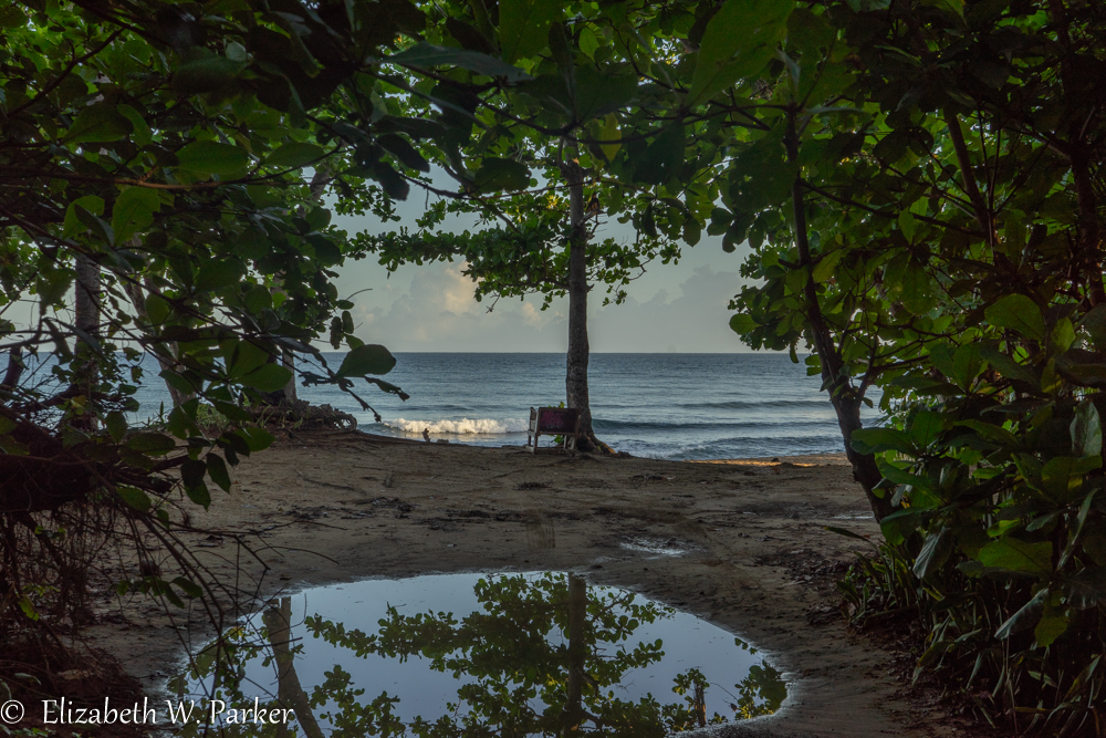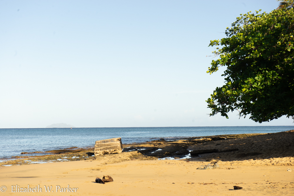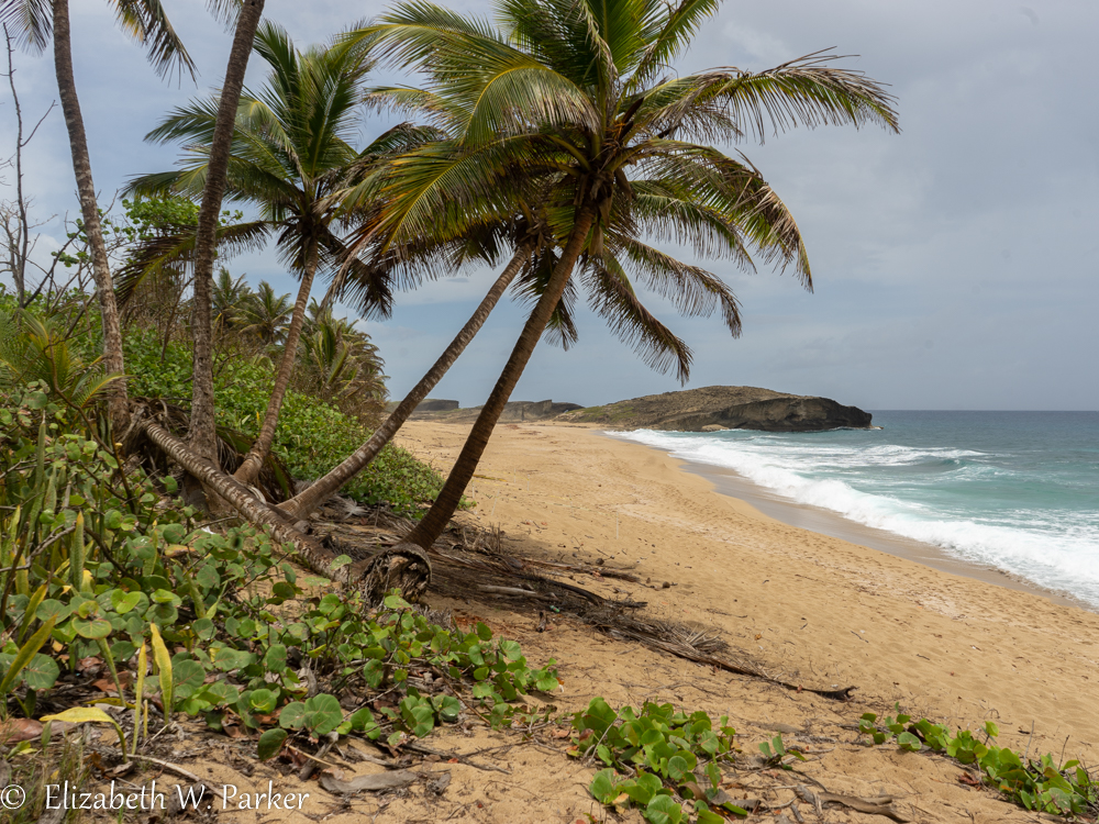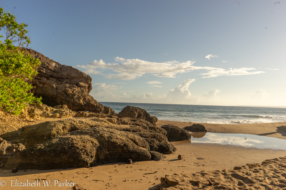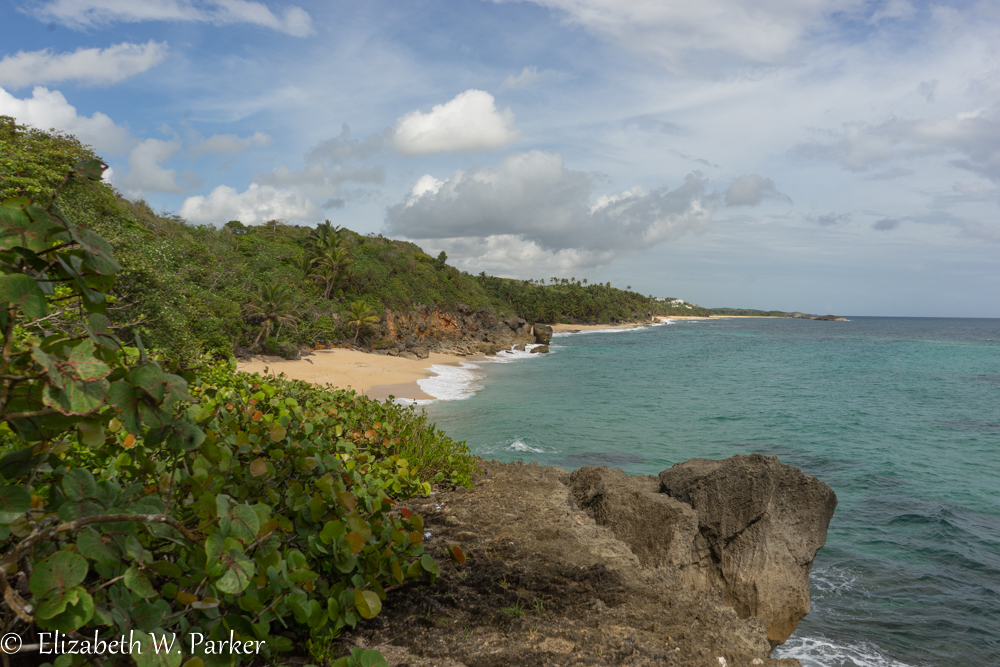 Los Tubos Beach, near Manatí, is a beautiful stretch of open beach on the Atlantic coast. As near as I could ascertain, Los Tubos refers to the “tubes” that form as big waves break, as in surfing. I didn’t know the north coast as a place for surfing, but I was surprised to learn that there are potentially good waves all year here because the beach is so wide and open. Right in the same area, moving westward is Playa Pata Pata. Pata pata in English means paw paw, a tree with a fruit of the same name. Though it is native to Puerto Rico, this is the first reference I have found for it. And, just beyond Pata Pata is the famous Mar Chiquita, a hemispherical sandy beach around a pool of calm water made by a break in the rocks that line the shore. On a Thursday morning, early summer, all three of the beaches were nearly deserted. Mar Chiquita is very popular with families because the water is safe for children. The rocks offer decent snorkeling.