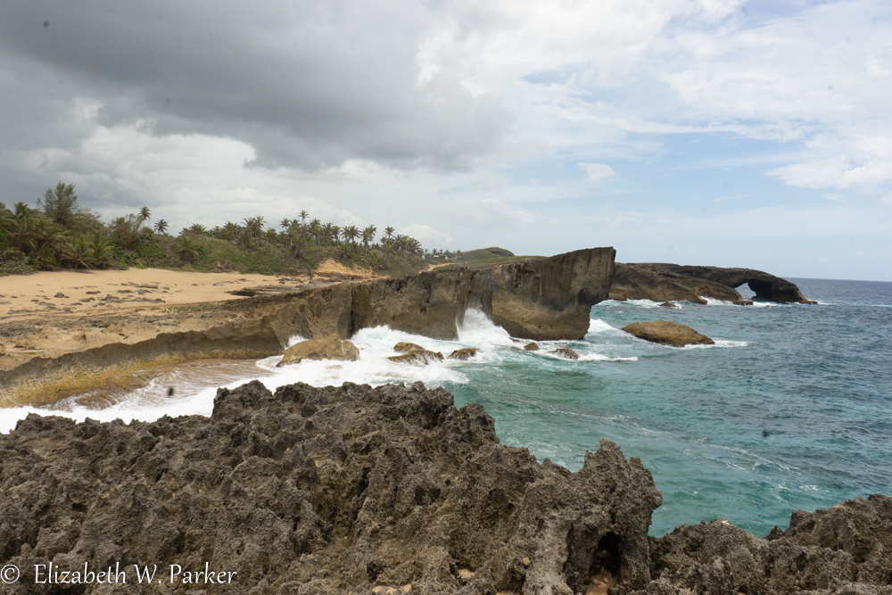 The sky was clouding up for the early afternoon “daytime heating” shower, so we decided to forego the Cueva del Indio (which has an entrance fee), and went in search of access to the beach nearby. We pulled off the road and climbed a steep dune and found the access we wanted. On the other side of the dune, another wide deserted beach greeted us, with some spectacular rock escarpments to the west. The beach has no name on the map, but we did find references to it as the Playa los Hippies. On Google it shows up as Arecibo Oceanfront Paradise, or maybe Playita Inez but there is no signage using any moniker.