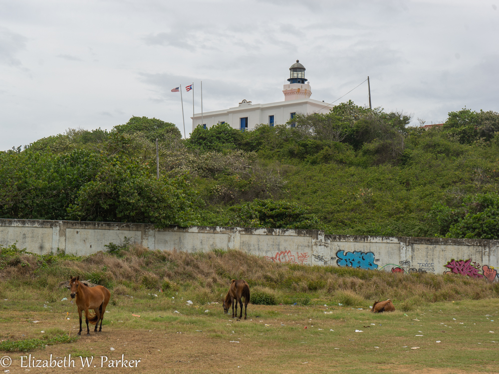 We did stop briefly at La Pozo del Obispo, a beach right at the base of the Arecibo Lighthouse, but we didn’t stay. Skies were grey, the place was crowded and we were hungry. We have also photographed it before, and I am chagrined to say that I know I have mislabeled it in the past. Like Mar Chiquita, it is a large pool created by waves that splash against the rock barrier and overflow into the pool in beautiful concentric rings. It is spectacular, and well worth a visit. I did take this picture of horses grazing below the lighthouse. The wall of murals is quite dilapidated. I suspect that was the work of Hurricane Maria, because I remember a long line of murals from my earlier visit.