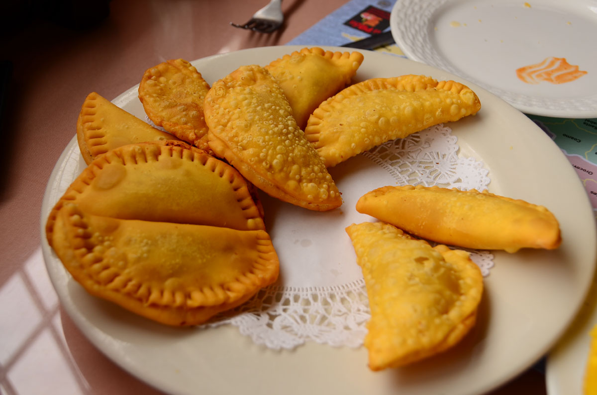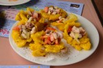 waitress didn’t tell us it was going to be too much. We ordered surullos (fried corn fritters with cheese inside), tostones rellenos (fried plantain cups filled with seafood) and empanadillas (fried fritters with meat) for starters. Fried, fried, fried! That’s the Puerto Rican diet. Each plate was more than enough for 4 people! We ate what we could and brought the rest home. For our main course we got an ensalada de pulpo (octopus salad) and a second green salad, and split the seafood between the two salad plates. Delicious and low cal! We were very full.