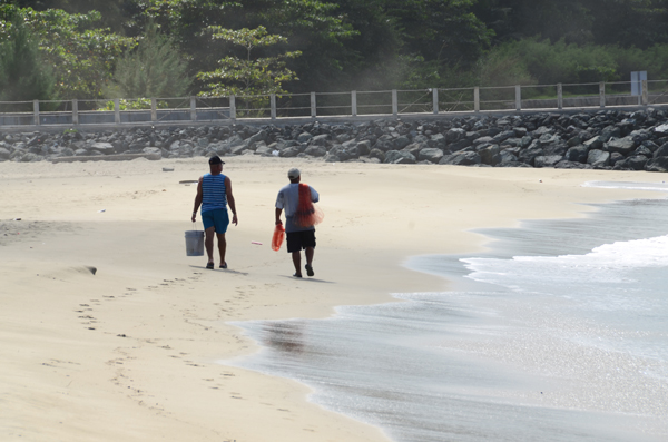 The assistant helped to free the fish from the net and minded the pail where they were keeping them.