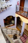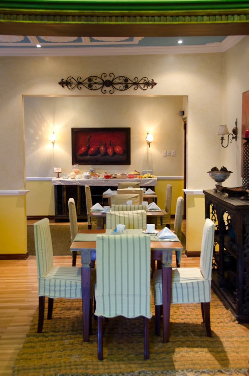Friday morning, I was awake early. I took a couple of extra minutes to wander around our hotel and take some pictures of it. The hotel has about 16 rooms in an old house, though I could locate only 10. Each room is decorated in the same style but with different details. All have wooden beds, but the bedsteads are not same room to room. The rooms are different sizes, too, and some are doubles, others singles. The first floor has rooms, but there is also a lovely dining room, where breakfast is served daily from 7 to 8:30 am. There is a library and a small living room-like room, in addition to a waiting area and the hotel reception in another area closer to the street level. Views from the rooms are of lovely gardens. (Click on any picture below to sc
