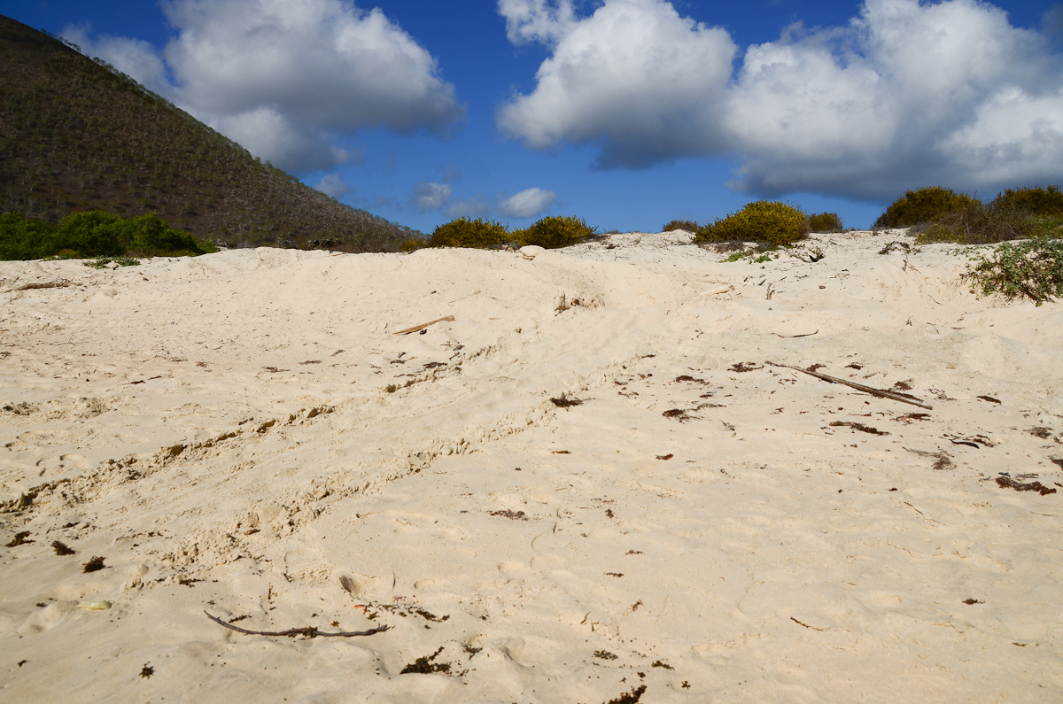 The “tank tracks” of the female sea turle as she makes her way to and from the nest.