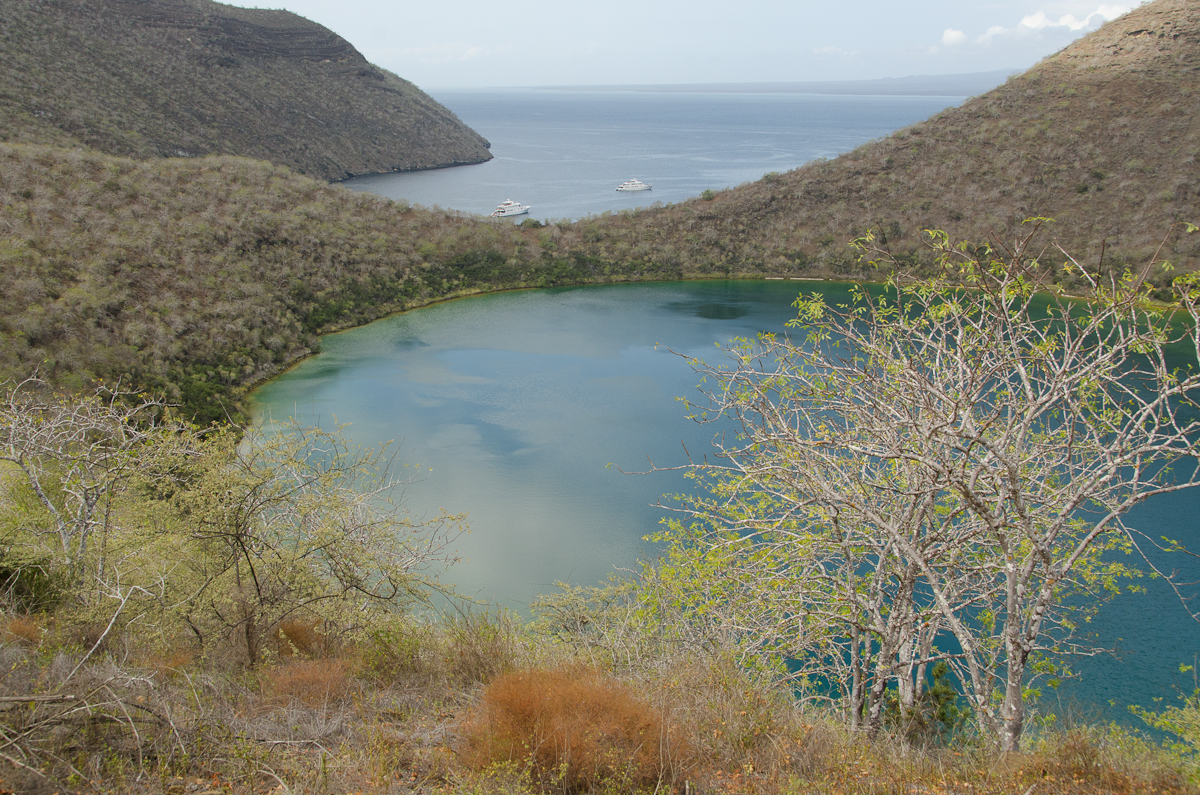 Following the ride, we disembarked on the island, and hiked up past Lake Darwin. In fact, we followed the path Darwin took when the Beagle anchored here in 1835. Of primary interest along the walk, beyond the views of Lake Darwin (with its strange colors) to the sea beyond, were all the different plants. The sub-species of “holy stick” (palo santo) trees in this is only found on specific islands.