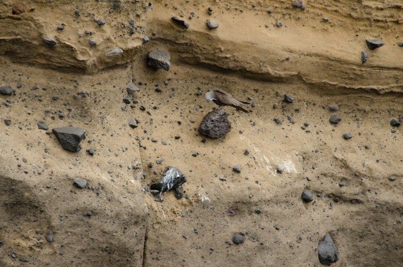 This shot of the layers of stone shows that the eruptions, and hence the fallout, were no purely ash. pieces of rock andballs of lava were also falling from the sky. Notice how easily you can see this is the rock record – and remember it happened (maybe) billions of years ago.