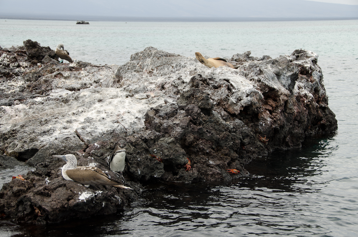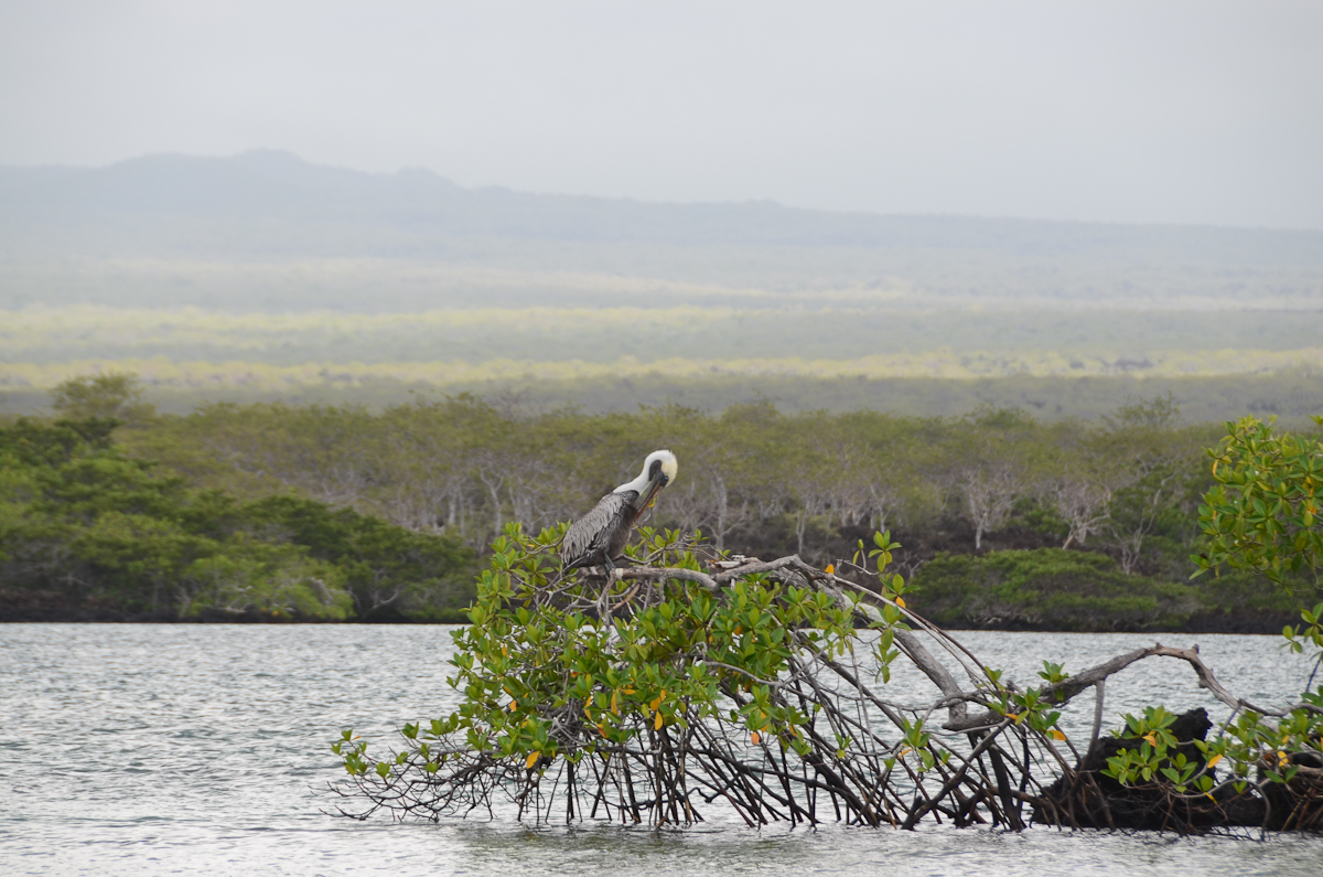 This morning, we have another panga ride! “Yeah!” says lazy, and getting lazier, me! Though it is hard to take pictures form the panga, today’s ride took us into quiet coves among the mangroves. We were on the hunt for sea turtles and birds and we were richly rewarded. Our first sightings were a pair of Galapagos penguins. These cute little birds are the only penguins north of Antarctica, and you have to wonder at the evolution that caused them to arrive and thrive here. Naturally, we saw pelicans – though I will always remain surprised to see them perching in trees!