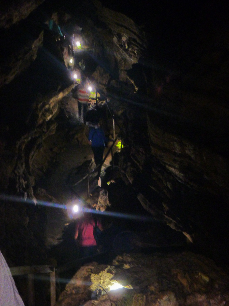 We had the opportunity to go down and into a giant lava tube. Thankfully the lights came on making the descent safer and the walls and ceiling of the tube easier to see. When I reached the end, I met up with a group talking with John, our fellow passenger and geology professor, explaining about how the tube is formed and what is happening to the rocks and minerals as the tube ages.