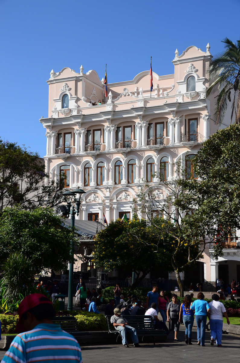 Another long drive (I would say that is the theme of Quito in general; everywhere involves a long drive) got us to the historic center of town. A huge traffic jam forced us out of the car to walk to find our lunch destination, an interesting sounding place called “Hasta la vuelta, Senor”. The restaurant was recommended to us by a young traveler Linda met the night before on her flight. It is located on the third floor of the renovated Bishop’s Palace, now an emporium of shops and cafes. It was a cute place and even at 2:00 pm on a Saturday afternoon we had to wait for a table.