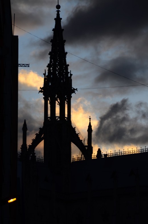 Evening shot of the tower of the Basilica silhouetted against a stormy sky