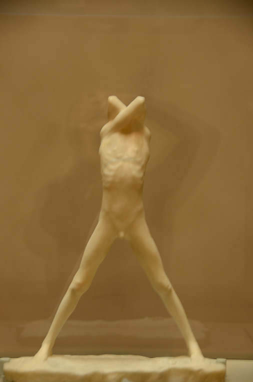 We got the audio guide and did the highlights tour, which had us moving quickly through the four pavilions, first and second floors, in search of those few major works by major artists. We got “defiant” after a while and just turned off the tour so we could walk through some of the other rooms of the museum. Doing that, I found my favorite piece, a small marble sculpture of an “emaciated young man” exposing his torso but hiding his head behind his folded arms. I woke up this morning thinking about the picture I took of it but kicking myself (metaphorically) for not having written down the name of the artist. The description of the statuette mentioned something about its autobiographical aspect.