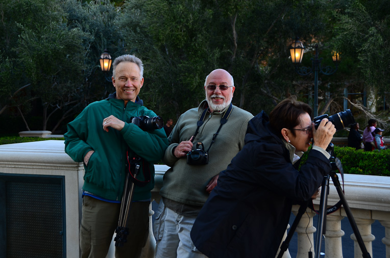 A short nap and it is time to head to the strip with our cameras and tripods.  The hotel has a shuttle that dropped us off at the Bellaggio.  That put us right across the Bellaggio’s “lake” from the Eiffel Tower.  After shooting for a while we were so cold we went indoors, but I found the hotel lobby way to populated for me, and Annie and I wanted to be outside to take pictures, so we went out again.  This time we slowly wended our way around the lake to the street side, and were rewarded with a fountain show in the lake. The show is done to music which is piped out to the world in speakers located in the cement balustrade around the lake.  Apparently it happens every 20 minutes or maybe on the hour…I heard both.  We caught just the tail end of one around 10 o’clock that was set to much more bombastic music than we heard in the early evening so it was accompanied by far showier fountain antics as well.