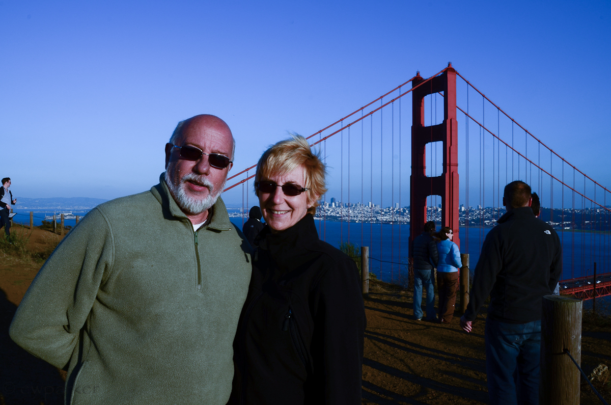 Once again on the road, following our friends, but before we completely left the wine country, we stopped at the Schug Winery in Sonoma. Schug was a wine we were familiar with and liked a lot from a bottle we had received in a auction lot at the Wayland Gala. Our hostess at the winery was a lot of fun, and we ended up purchasing a case of wine which we had shipped to Milwaukee. Somehow we timed that drive to arrive at the Golden Gate Bridge at sundown, so we had a final picture taking frenzy (it was cold and windy) before we jumped on our plan and headed home.