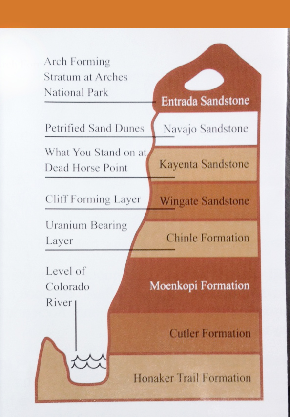 All the rock in this area is sedimentary. But, you will see rock layers that are vertical – as if there had been metamorphic factors at work. The explanation I read says that water shaped this landscape, not wind. Water dissolved the salt deposits. As dome-shaped salt deposits were emptied, the domes collapsed and the rock layers above tipped. This is what accounts for their being vertical in some places. Likewise, salt and softer rocks eroded faster, creating the mesas, buttes, spires, windows and arches that we see all around us. It is hard to believe that these structures aren’t ready to fall at any moment…and honestly, the signs say that if you hear a popping or cracking sound, you need to move away from the rocks as fast as you can.