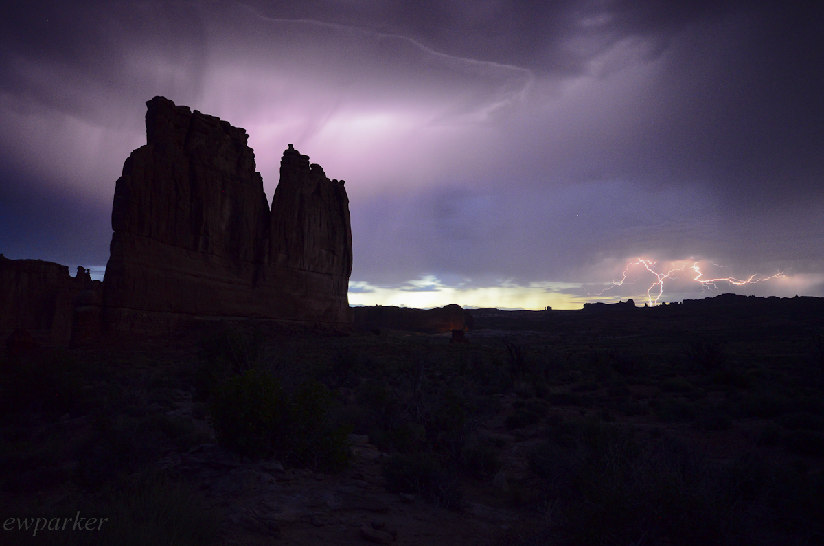 The next morning shoot (Tuesday) we were in the van and headed back to the park at 4:00 a.m. The early hour is because we would like to shoot the stars, and hopefully the Milky Way, while the sky is still dark. Once we arrive in the park, we are greeted with a thunderstorm. (That’s a good thing!) It makes taking pictures very interesting! We were shooting in an area called the Courthouse, or the Courthouse Towers. What I thought looked like “The Three Kings” are actually referred to as “the judges” but I think you can conjure up an image: A bunch of guys huddled around conferring. Here the “guys” are tall spires of red sandstone.