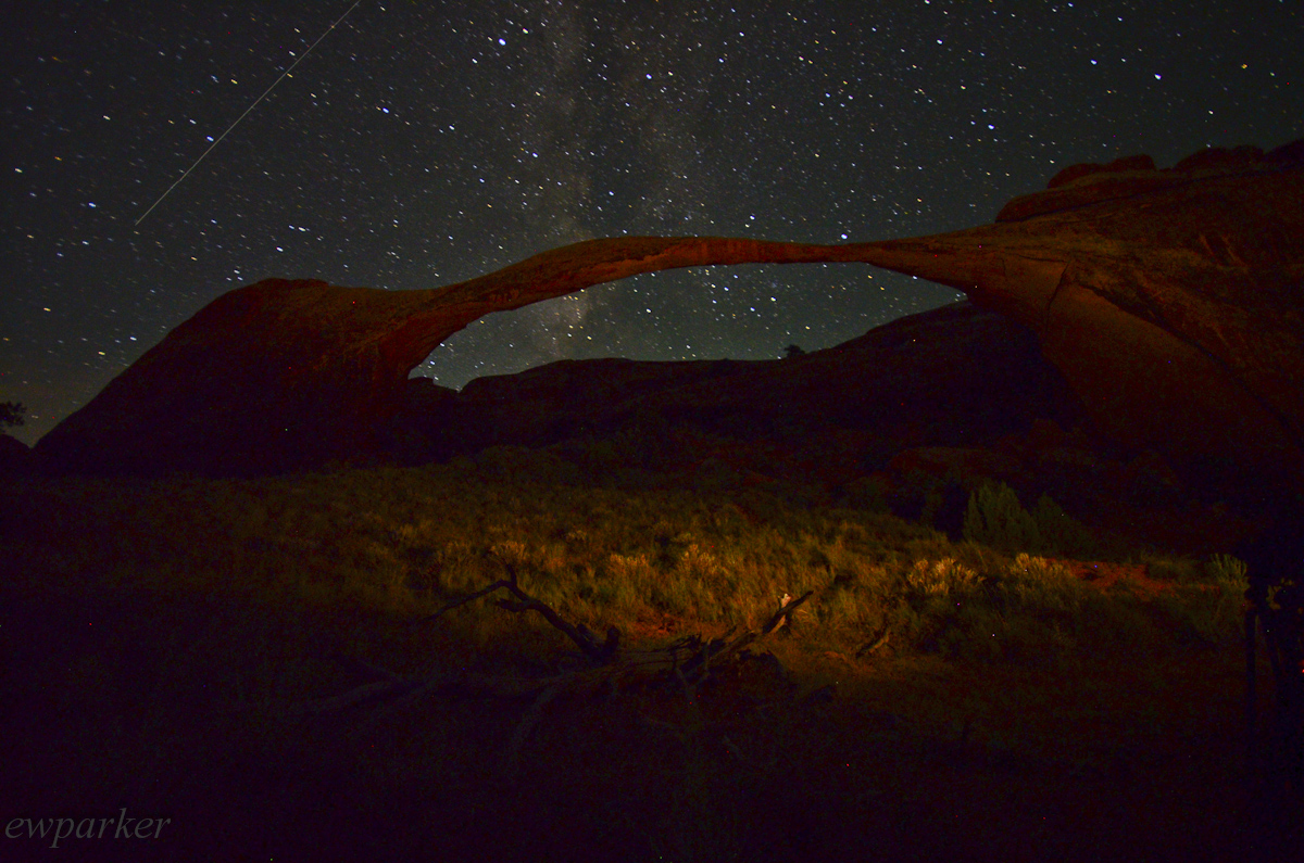 The orange glow in this shot is the light from Moab reflected off the clouds. The rock is lit by flashlight painting.