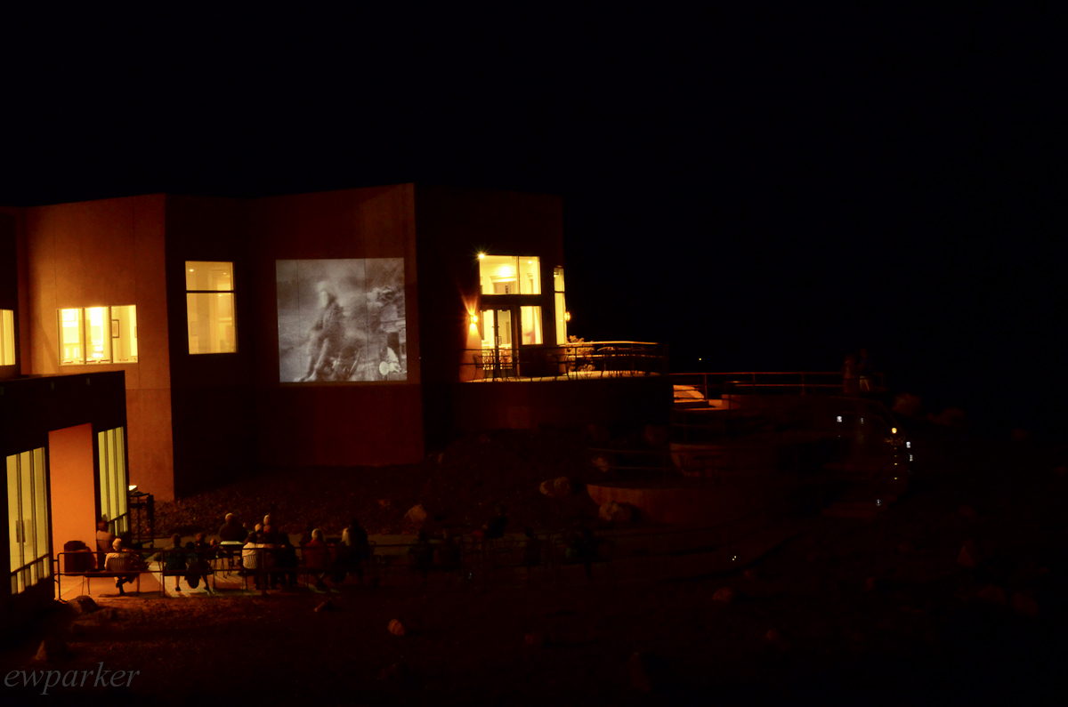 The hotel shows movies that were filmed in Monument Valley at night on this outside wall.