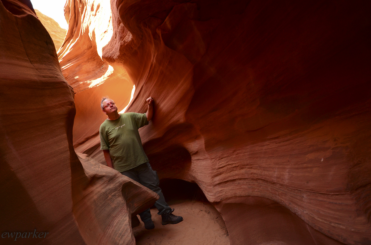 On our final day of the trip we traveled another two hours to near Pages, Arizona to photograph Upper Rattlesnake Canyon and Antelope Canyon. These shoots were accomplished with a Navajo guide, in our case one from a photography-focused agency called “Adventurous Antelope Canyon Photo Tours”! Our guide was very knowledgeable about the conditions in the canyons for good shots, and lined us up for the best angles. He also threw sand into the sunbeams so they would show up in our photos. It was a great experience. Though I will probably throw out 95% of the 1000 pictures I took, I expect to have at least some that document the experience, maybe even one worthy of framing.