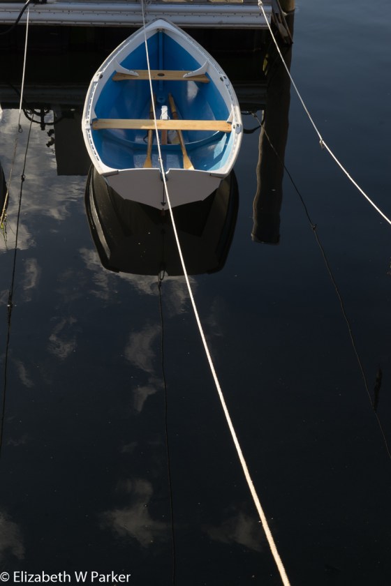 “Her friend, her rescuer, her escape, her boat. He waits for her patiently, secured to the dock. He beckons to her, bright and clean, white and blue. Adventures await them. Their partnership is sure; There is love on both sides. The black water, softened by the dawn clouds, does not frighten them. They’re ready to go.”