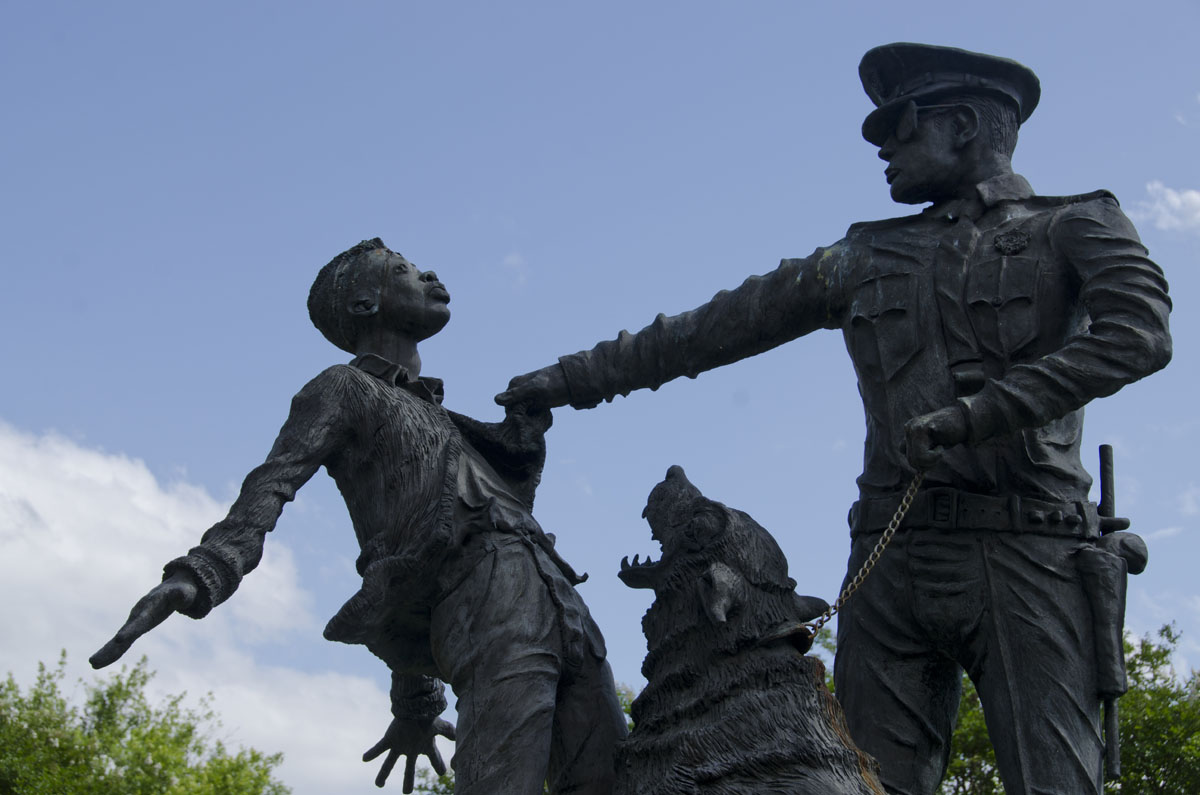 This sculpture recreates a news photograph of the same scene – where the policeman allows the dog to attack a man.