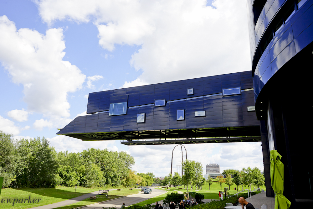 First we visited the Theater. At 1:00 pm on a Saturday, you might reasonably ask why we would be going to a theater. Good question, but simple answer! This is an unusual building with some very interesting vantage points for view the scenery around us, which includes the Mississippi River! The building has a feature called “the Endless Bridge,” a structure that sticks out the side and ends (despite the name) in a protruding terrace from which there are spectacular, if also dizzying, views.