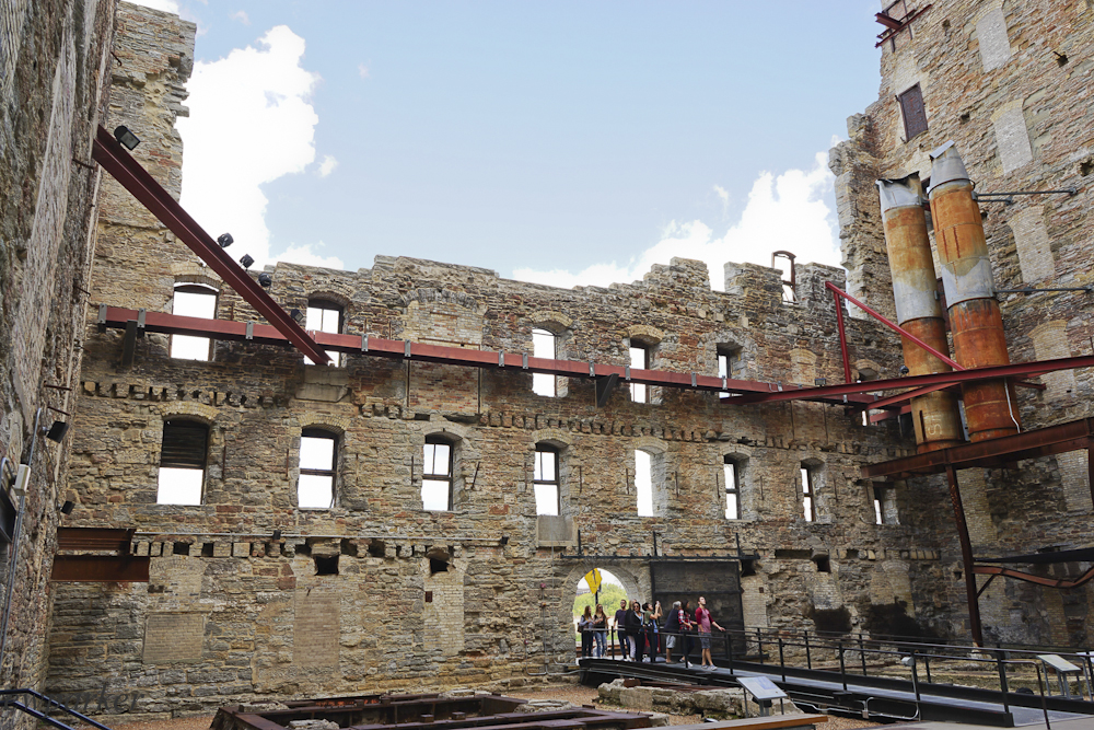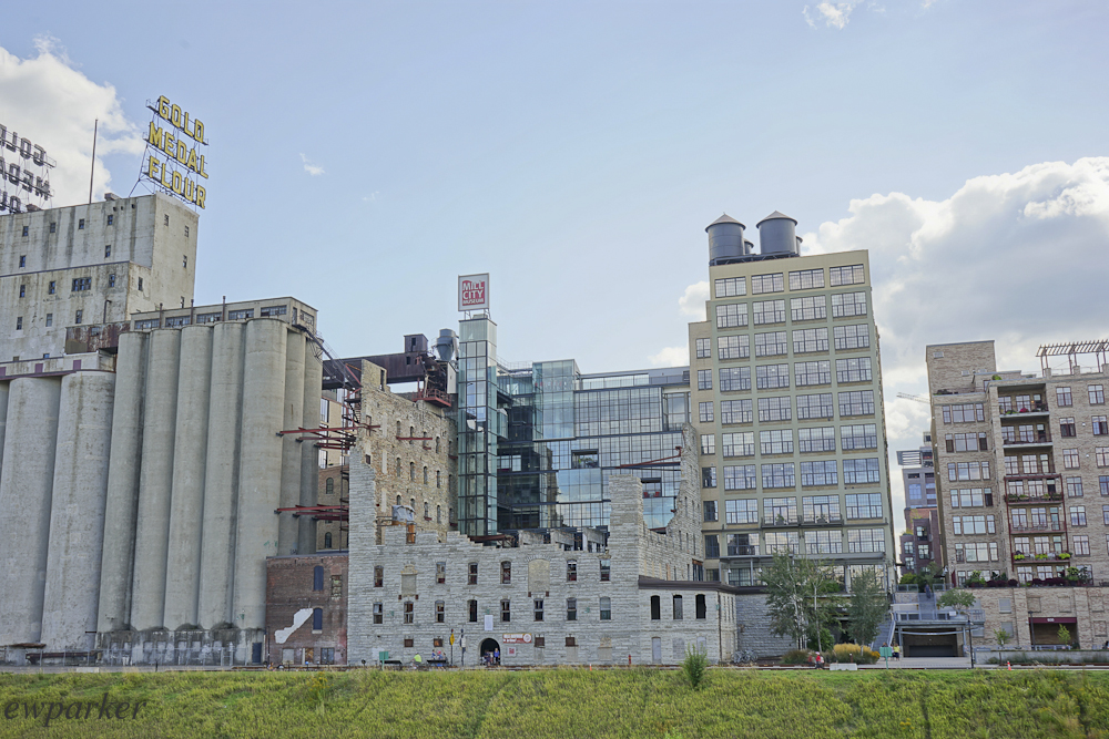 Next, for our afternoon entertainment, we headed to the nearby Mill City Museum, eager to learn something about the history of Minneapolis. Evocatively located in the ruins of a flour mill that exploded in 1887, we learned all about how enterprising settlers arrived in this area and immediately put the “waterfalls” to work powering flour mills. The dam improvements are still working, though the mills have long since ceased to function. Still the history was interesting and the museum well planned and executed. First we watched an entertaining film about the history of Minneapolis, and then a multimedia show that included our sitting in a freight elevator in a long defunct and burned milled to learn something about flour milling. Well done and enjoyable, it was also very informative. That Flour Tower Tour ended on the top floor of the ruins from where we had a beautiful view of the river and the mill ruins.