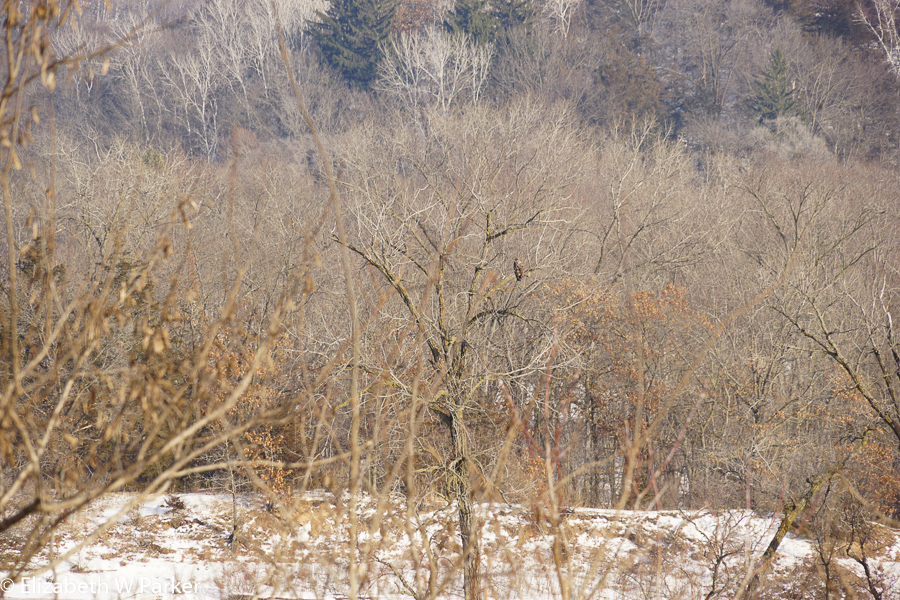 This winter is not a particularly harsh one. We do not have a lot of snow covering the fields so eagles can still hunt for rodents (rabbits, mice, squirrels, etc.) in the fields and are not totally dependent upon the open water. And though we have had frigid spells, the river is not frozen, mostly because of how fast the water is moving. Those factors, together with a deluge of eagle watchers, connived to make eagle spotting a bit of a chore while we were there. We managed to see a few, but not nearly the number we had imagined.