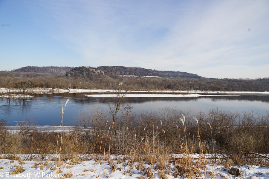 The Wisconsin River at Sauk City / Prairie du Sac, Wisconsin. Note the bluffs on the east side of the river. This is where the eagles overnight.