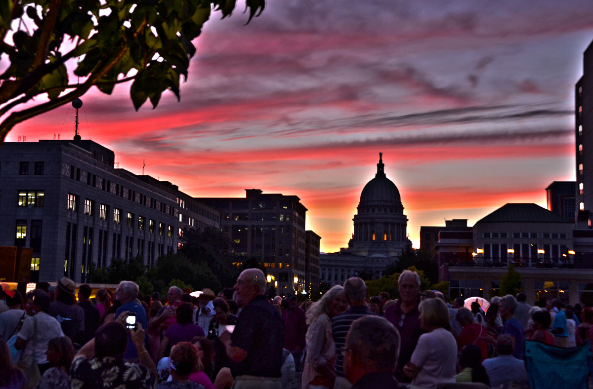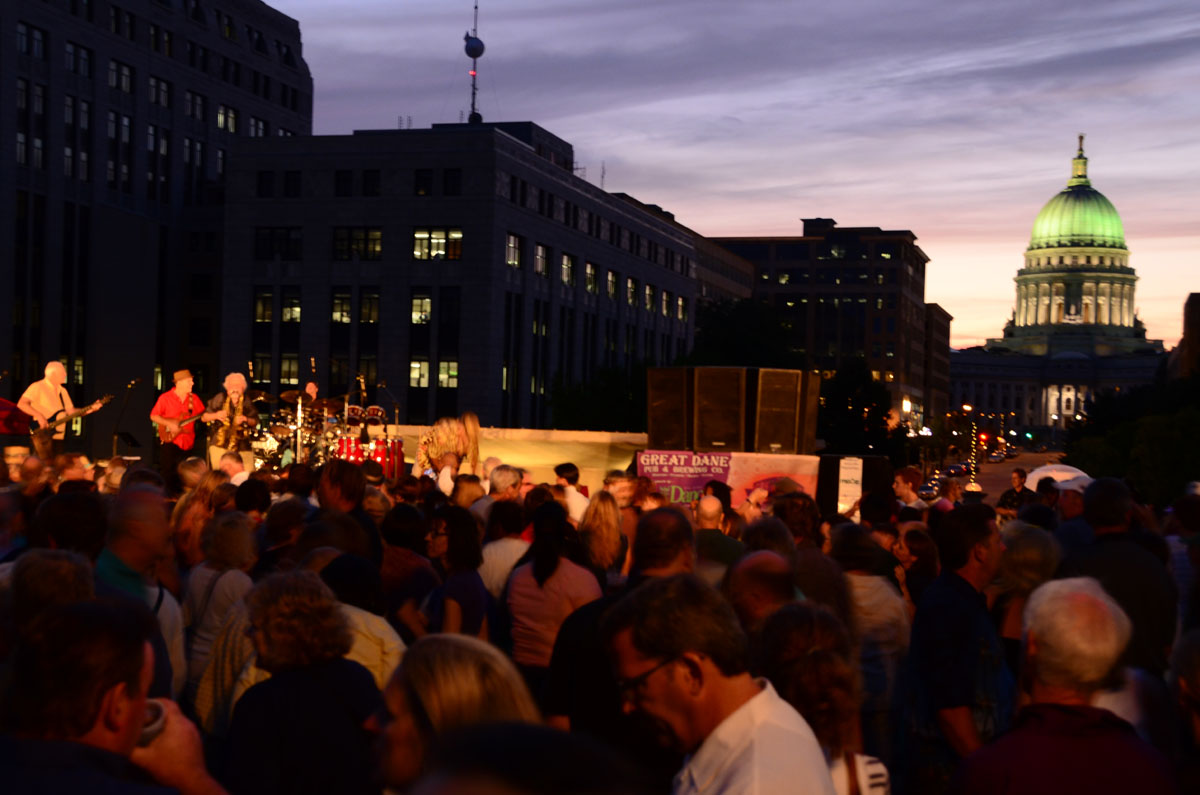 Every Friday in August, you can enjoy the summer evening at Monona Terrace in Madison, just like we did last weekend. Don your dancing shoes or just sit and enjoy the music and watch the dancers. What a venue for an outdoor dance! Frank Lloyd Wright’s beautiful outdoor space overlooks the lake on one side and the majestic, if currently controversial, Wisconsin state capitol on the other.