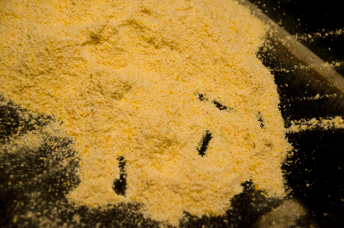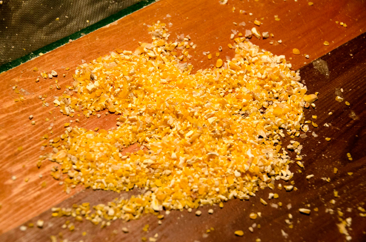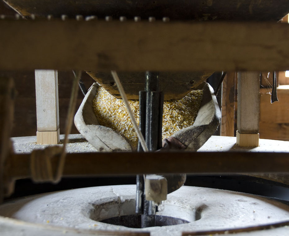 Here is the corn on it’s way into the grinding stones. The black metal shaft you see is turned by the water turbine and it turns the top stone.