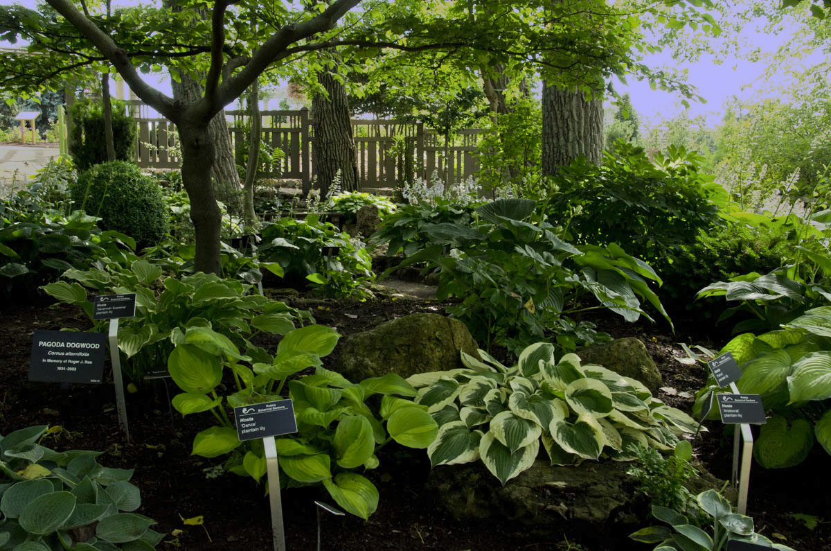 The Rotary Gardens has an area designated “Hosta Haven” but that little intimate space (and there are many such spaces throughout the gardens) belies the fact that there are hostas everywhere. In the Haven, the sign says there are 50 varieties in, I am not sure if, just the “haven” or in the entire gardens. Either way, a walk around the gardens will reveal giant hostas as well as tiny hostas; hostas in all manner of costumes (striped, plain, glowing, dark); with all shapes of leaves (from pointed to rounded).