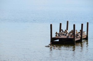 Merganser Convention. The mergansers had their chicks really early because of the warm spring so they are almost adult size already.