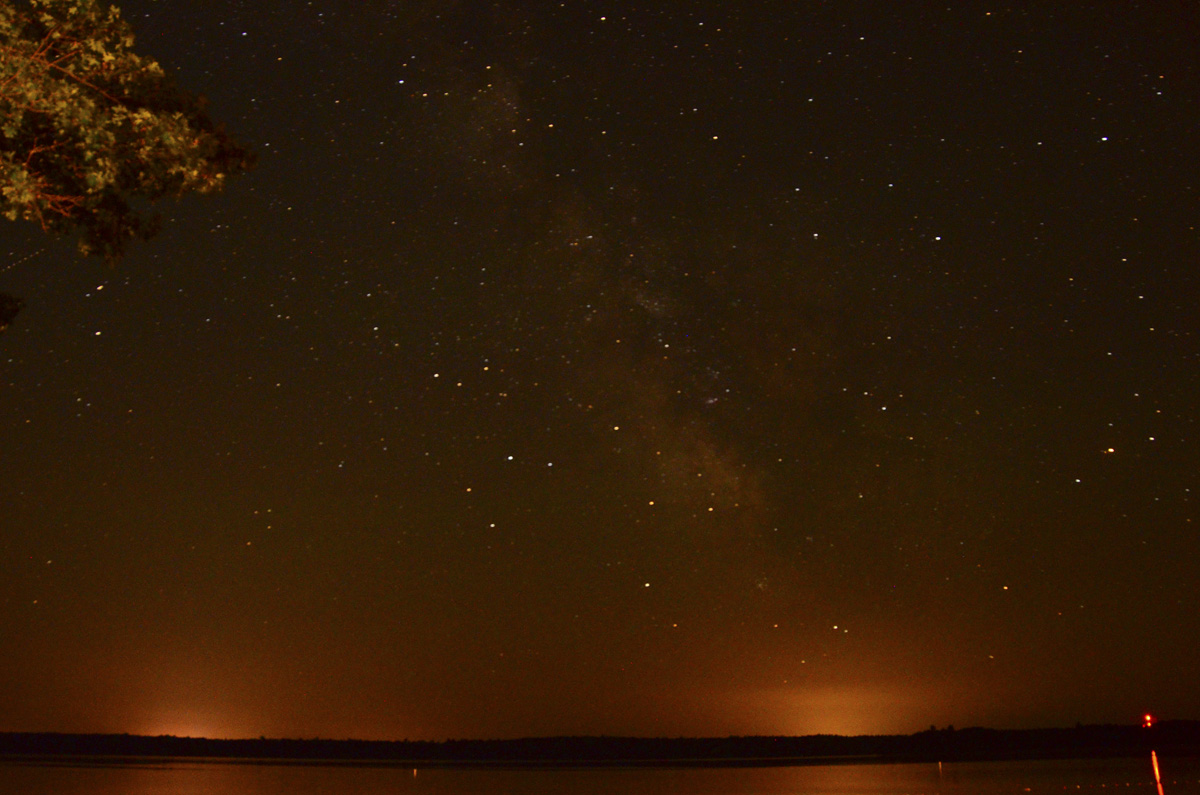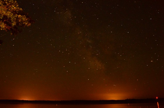 Shortly after it finally got quiet, Gerry went to bed.  I stayed up to take night pictures – the stars over the lake are amazing!  Last night we were supposed to be able to see the aurora borealis, too.  I went out between 10:30 and 11:30 and took pictures – some eerie glowing on the horizon, a couple of lightning flashes, a serene and beautiful evening on the lake accompanied by the call of the loons.  A perfect way to end any day!
